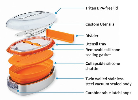 The LunchPod is a leakproof, stainless steel, twin walled, vacuum-seal insulated lunch box with custom utensils, BPA-free Tritan double lid, and carabiner loop latches